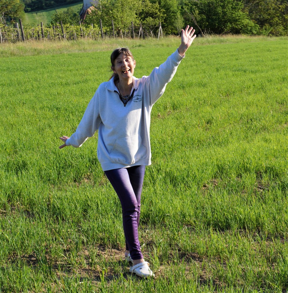 This is our local church we are high up the side of the valley and I’m having fun, dreadfully modelling for “I can’t use the camera Eric” standing on the edge of a wheat field!