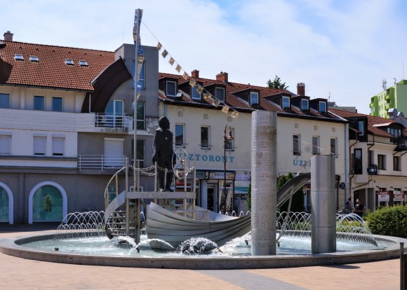 In the main square of Siófok, at the foot of the Water Tower is the statue of Count István Széchenyi placed in the middle of a circular fountain in 2012. The large bronze and chrome steel statue depicts the Count standing on the first steamboat of the Balaton, the Kisfaludy, as Széchenyi was the founder and lifetime president of the Balaton Steamship Company.