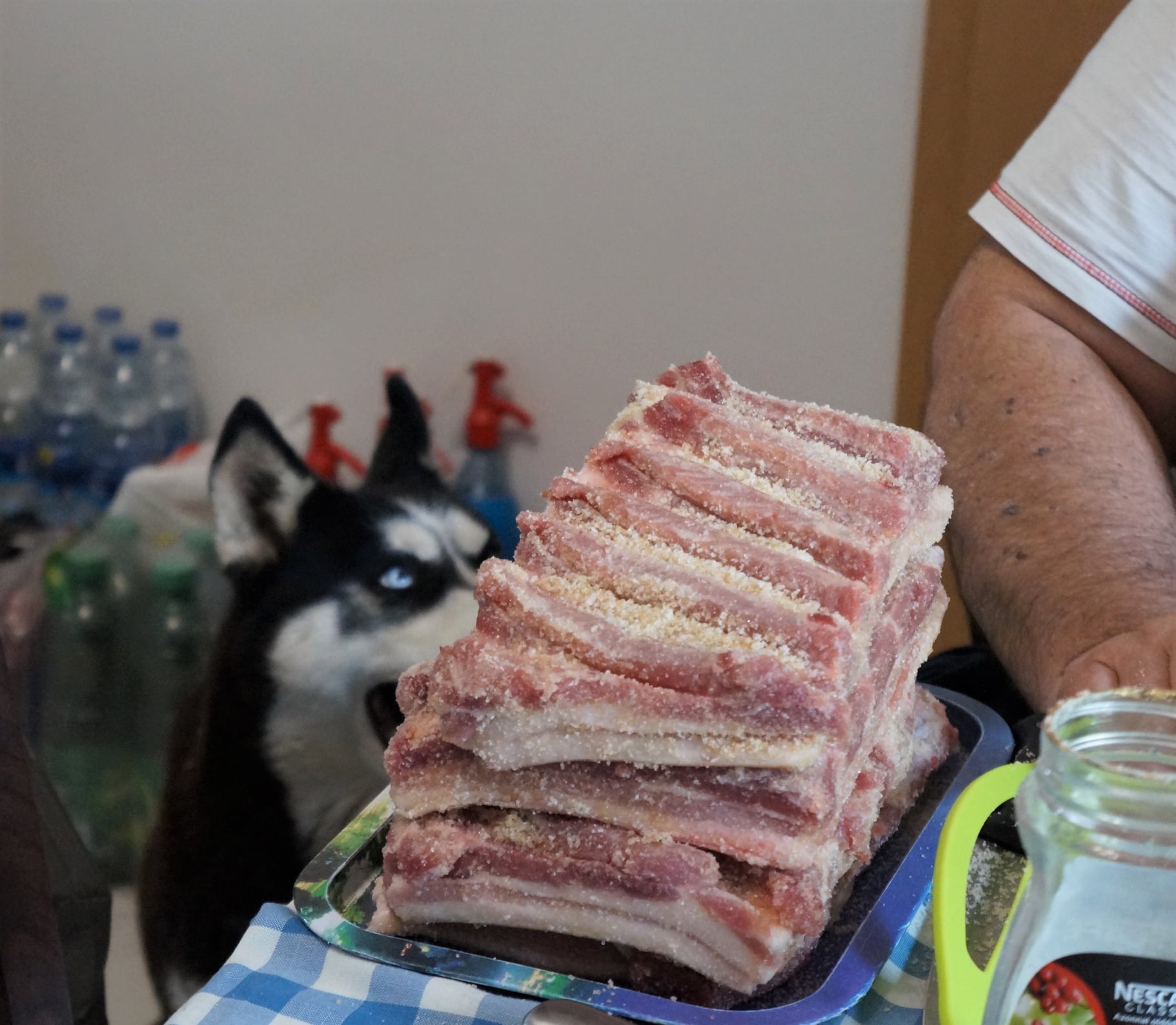 We all like bacon in our house and was a little disappointed with Hungarian bacon so decided we should make our own smoked bacon. We invested in a meat slicer and bought a huge piece of belly pork with the skin on. Next, we removed any bones and cleaned the meat thoroughly. We then pricked the meaty side very well with a fork, made a salt and brown sugar coating 50/50 and rubbed it in very well all over. Then we wrapped it up so it was sealed (carton or cling film) and put it in the fridge for 2 days. After 2 days, we removed the pork from the fridge, washed it well to remove the coating and dried with it with kitchen towel. Now for the smoking. We created a homemade smoker from wood we had in the garden and cold smoked the bacon for 3 days in the smoker. The aroma around the garden was tantalising. Finally, after 3 days we sliced and ate it. The bacon freezes well if necessary. We shall never buy bacon again, it was so delicious and had a gorgeous smoky taste.