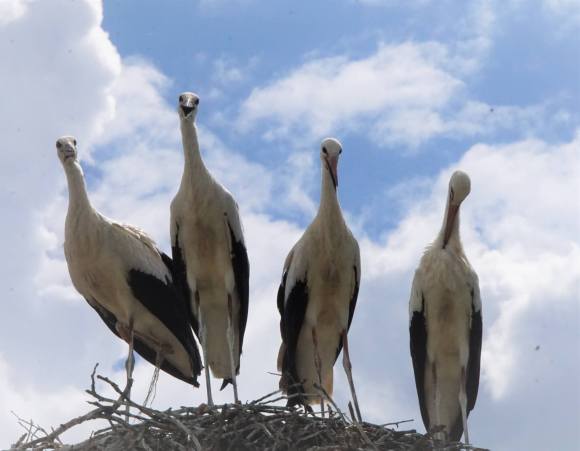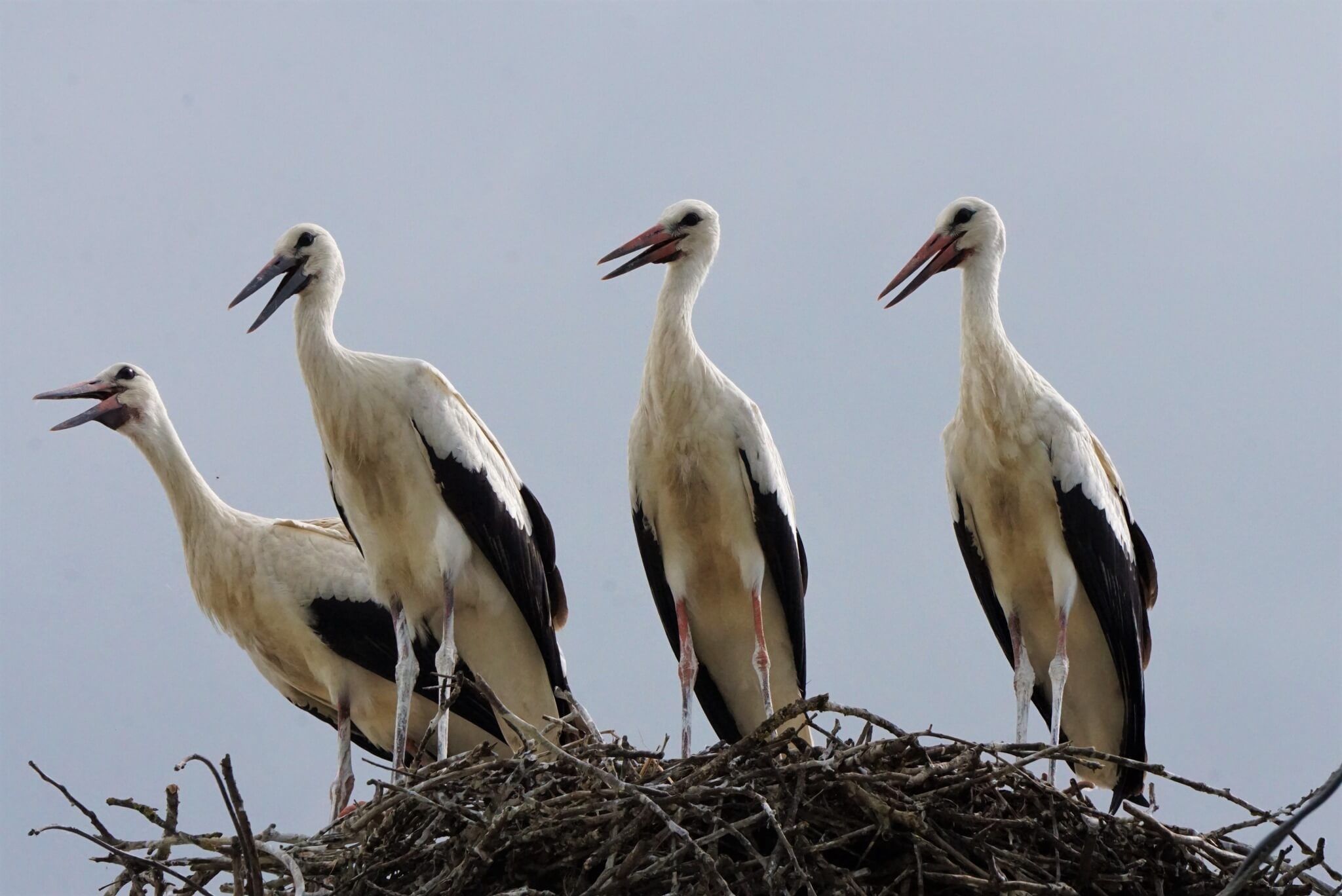 My final magnificent photo of storks is with their beaks open (as it was extremely hot that day, it is their cooling mechanism) all stood to attention, four in a row and looking rather dandy!