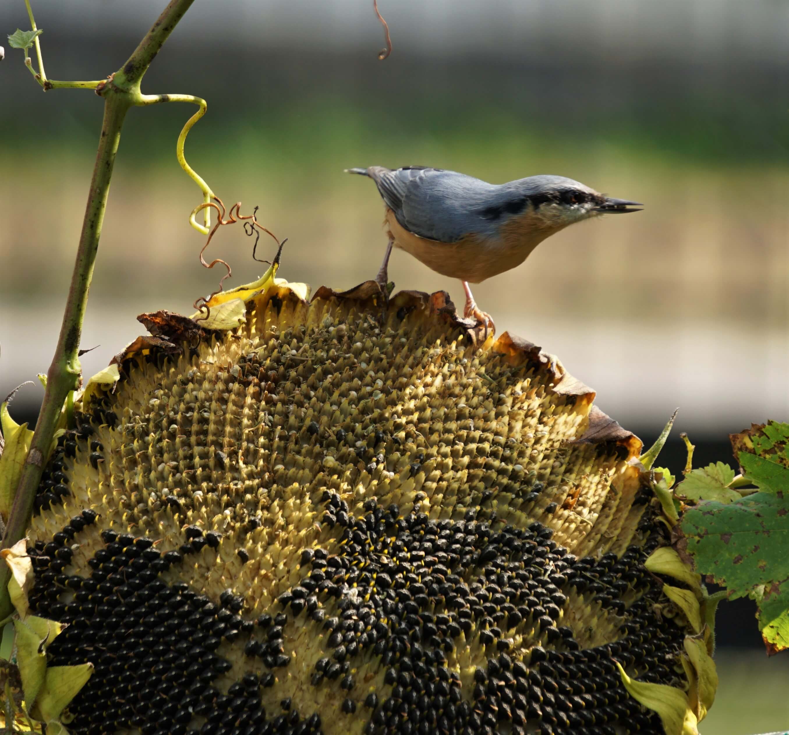 As you can see not only humans enjoy sunflower seeds. This photo is taken in our garden. The head was full of seeds until this greedy Redhatch spotted the feeding opportunity and took as many as possible. He managed to stuff three or four at a time into his mouth and fly off to feed his babies only to return 2 minutes later for more. Other smaller birds tried to get a look in but the Redhatch seemed quite dominant and a bit of a bully, chasing off the smaller birds trying to get a look in.