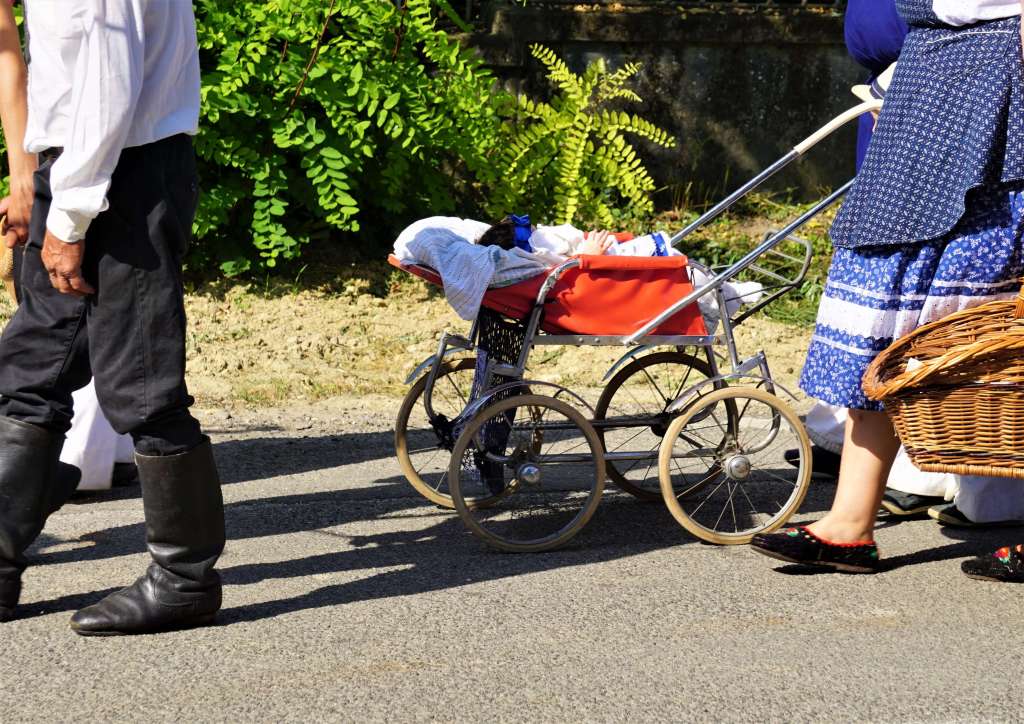 As the procession of villagers got underway there were several photographers recording the event, just like me!📷 Traditionally whole families including the children all went down to the fields. This was one of the very old fashioned prams used to transport baby in…there is a real baby in there!