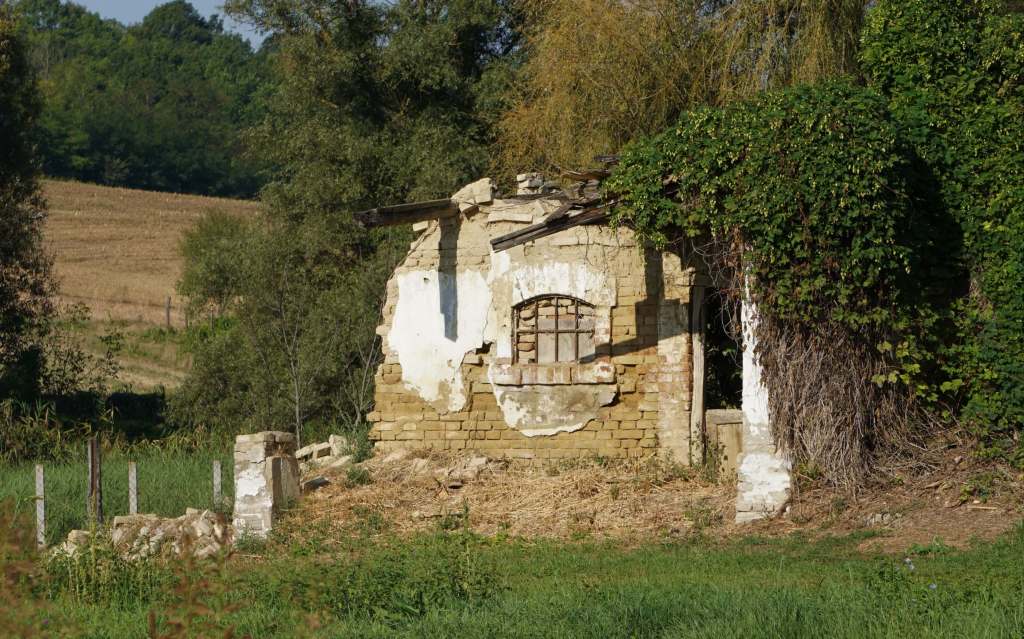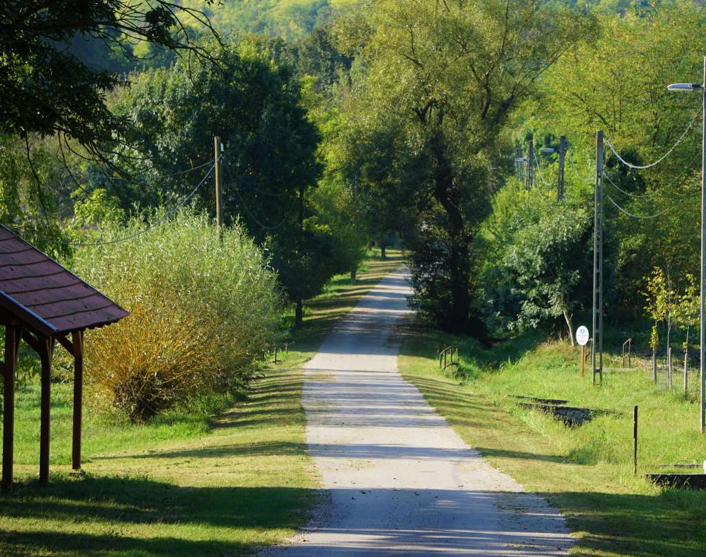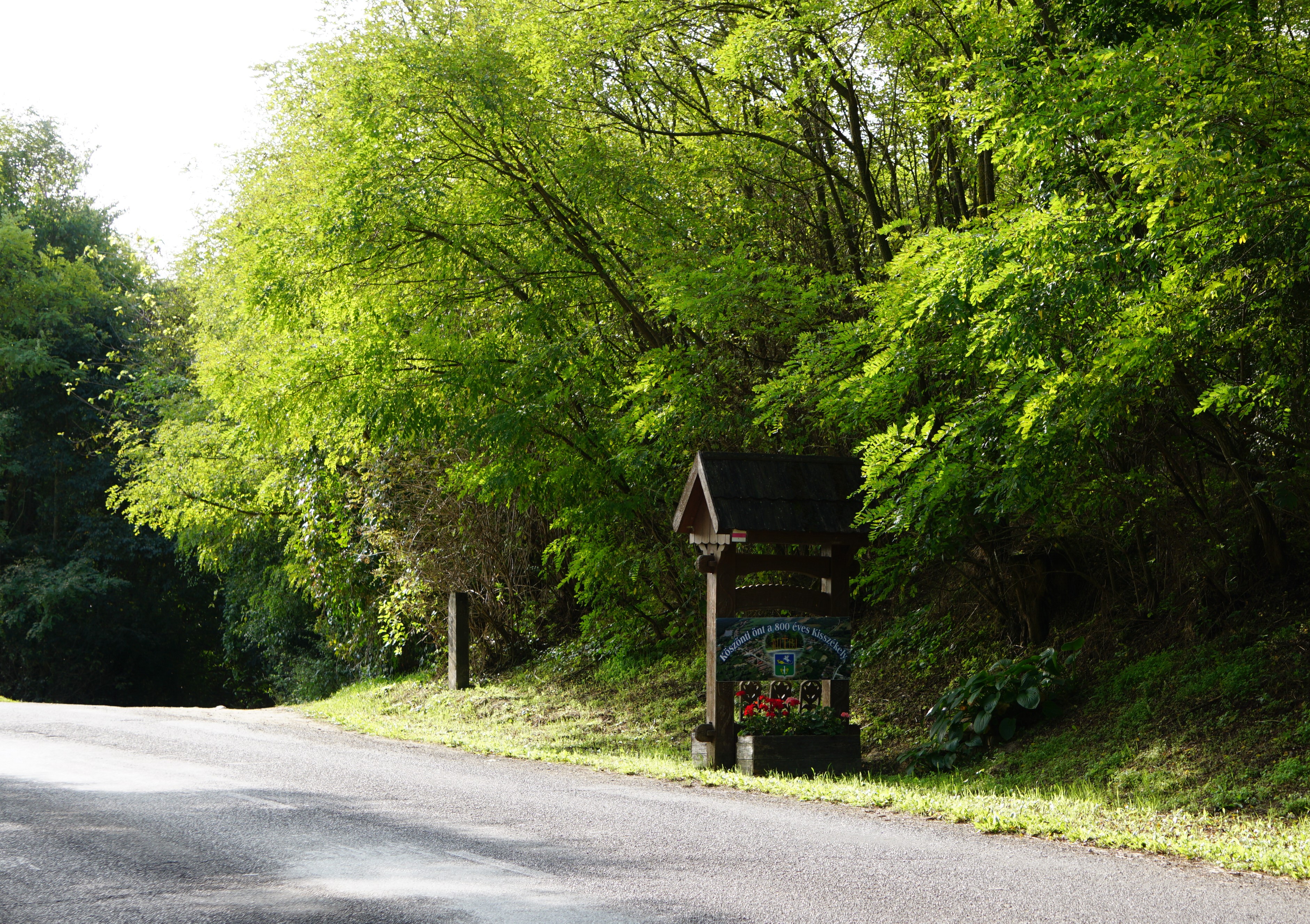 A typical Hungarian village square, with a sheltered bus stop, pretty pastel houses, changing autumnal trees and a river running through the centre.