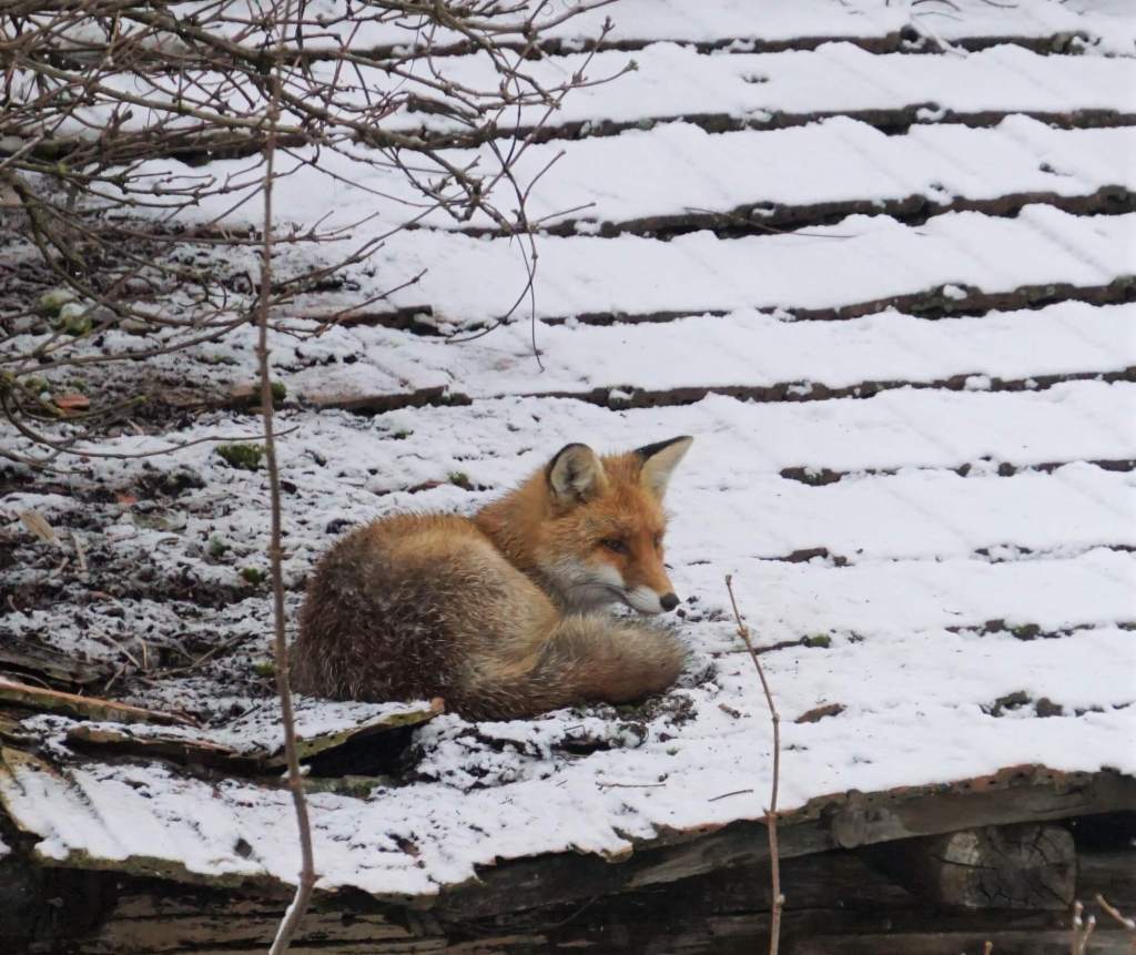 This fox was one of many that lived in the next door empty house. It had and still is been empty for at least six years and fox families had made their home there. This happened to be my first “daytime” sighting of a fox…sitting arrogantly on top of our barn!