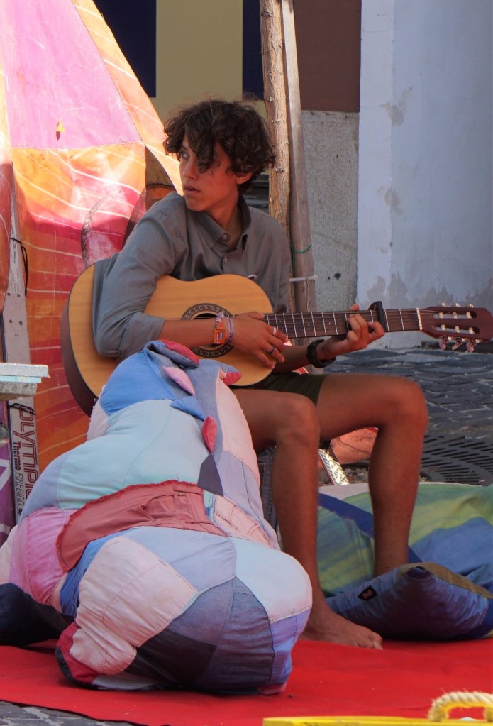 The gentleman with the less than substantial hair looked as if he was the next target for a hitman! Unfortunately for him, he will have a nice rosy sunspot on his head, and perhaps a hole in his white shirt! The midday sun that day was very strong. I noticed he had obviously taken care with his outfit matching his crocheted looking top with a white plastic watch!